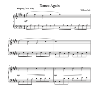 “Dance Again” is an upbeat classical-sounding piano solo in the key of E major. It utilizes broken triads as accompaniment as well as legato/staccato contrast playing.