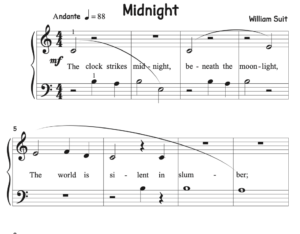 “Midnight” is based on the A minor scale. It is easily played by placing the thumbs side-by-side on B and C. While it is written at middle C, try teaching it an octave lower. The song is seasonally adaptable.