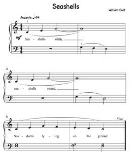 “Seashells” is written in C position and can be used to reinforce the beginning student’s understanding of the C five-tone scale. It features the C major triad and the descending C five-tone scale. It can be adapted easily to a right-hand-only song. Lyrics are included.