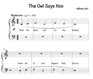 From the piano book, “The Own Says Hoo” by William Suit for mid to upper elementary students. Learning good technique at the piano should be a fun experience. These ten songs are from the original vocal book, “The Owl Says Hoo” They have been rewritten as piano solos that are accessible to mid and late elementary students. Also included are the lyrics so that adventurous students can sing along while they are playing. These songs can be used to establish confidence in finger placement and movement of the hand positions. Some of them such as, “Frozen Pine Cone” and “Shooting Star” reinforce the use of the C scale. The chromatic scale is explored in “Hummingbird” while ocatve jumps are covered in the haunting melody of “Snowy Owl.” ©2023 William Suit